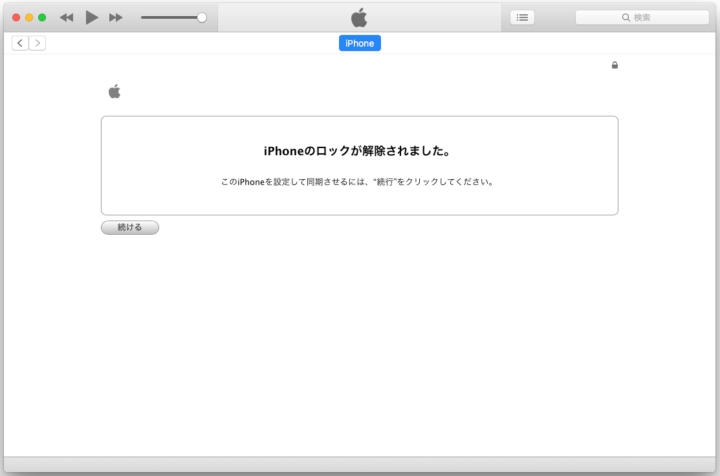iPhoneのSIMロック解除が確認できたら、引き続きiTunesから[続ける]をクリックし復元作業を行えば完了です。