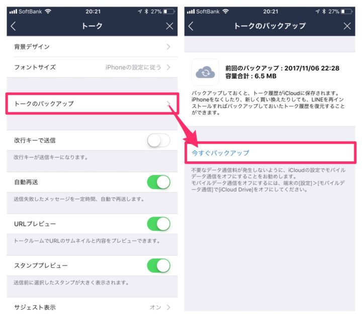 iCloudにトーク履歴をバックアップしておけば、iPhoneを機種変更する時にアカウントを引き継ぐと同時にトーク履歴も一緒に引き次ぐことができ大変便利です!