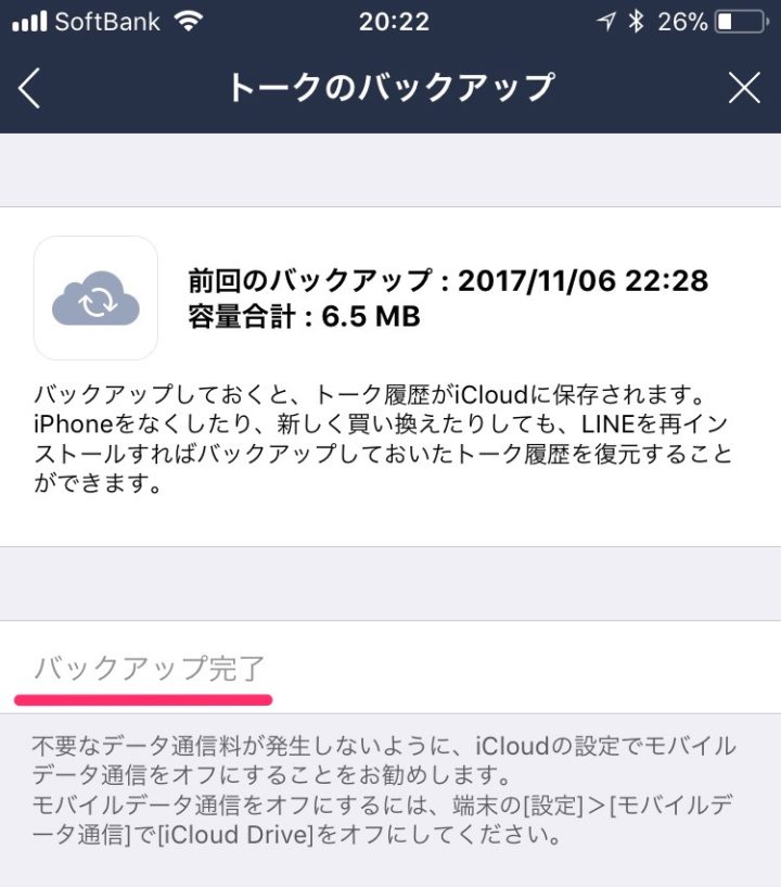 トーク履歴の内容によりデータ量が多くなる場合があるので、Wi-Fi環境で行うことをお勧めします![バックアップ完了]と表示されれば、トーク履歴のバックアップは完了です。