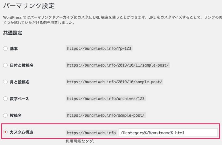 ここで[カスタム構造]で[/%category%/%postname%.html]のように指定しています。