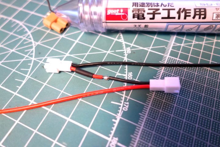 手元に2セル機が徐々に増えていき、まだ肝心の充電器の選定ができていない時にやっていたのが1セルバッテリー×2本(JST-PH2.0プラグ)→XT30への変換ケーブルを作成し1セルバッテリーでの運用をしていました。