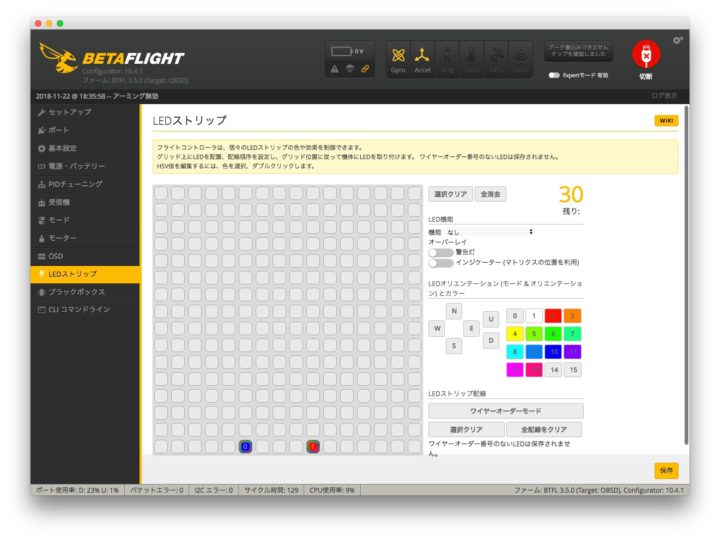 ここまでくればあとはお好みでBetaflightの【LEDストリップ】からLEDの色や点灯方法などを設定するだけです。