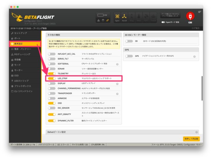 Betaflightの【基本設定】からLED_STRIPをオンにします。