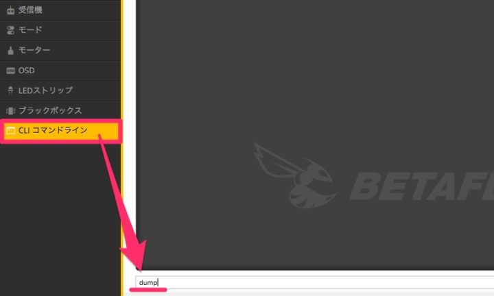 Betaflightの【CLIコマンドライン】から【dump】と入力。