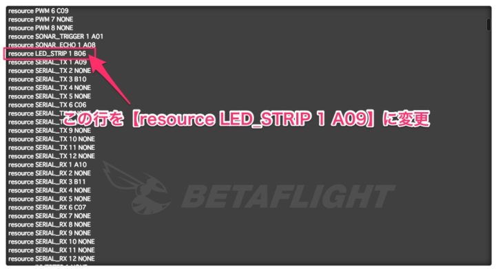 その1行下には【〜TX1 A09】とあり、現在FCのTX1ポートにLEDを繋いでいるので上記の行を【resource LED_STRIP 1 A09】に変更する必要があります。