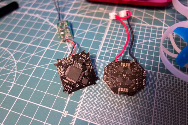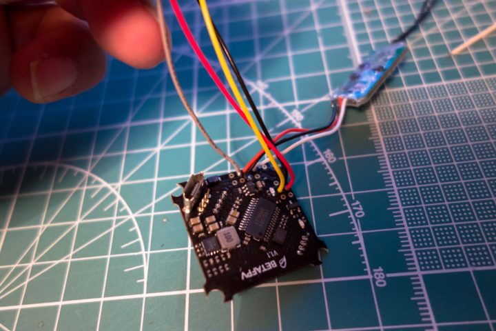 上記の図を参考に配線していきますが、FC上部に乗るカメラの邪魔にならず見た目もスッキリされるためFCの裏面にリード線が来るように今回は半田付けしました。