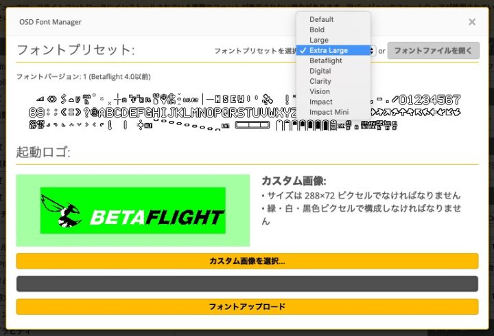 BetaflightでのOSD画面のフォント変更についてコメントを頂いたので少し残しておきます。
