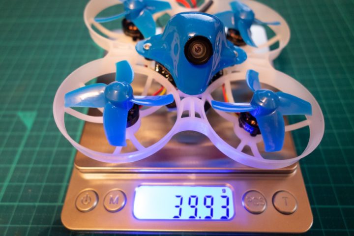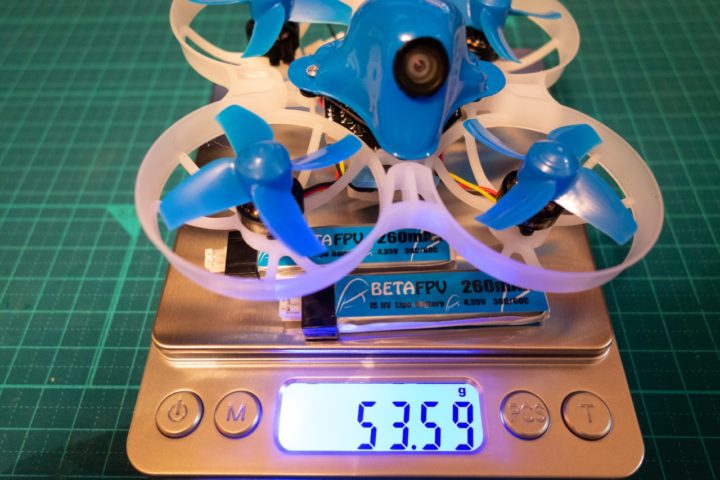 BETAFPVの公式サイトには、1S300mAh(Rate30C)のバッテリー重量は約7.5gとなっているので2本で約15g、また2S300mAh(Rate35C/70C)のものは約17gとなっています。