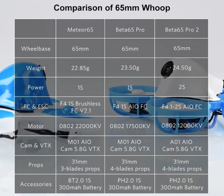 まずは現在発売されているBETAFPV製65mmブラシレスWhoopの比較です。