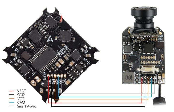 VTXの裏面に電源やOSD、Smart Audio端子などが付いているので、付属の5ピン端子を対応するBETAFPV製のFCに設置すれば、FCにこのカメラを差し込めば全ての機能が使えるようになります。(もちろんハンダで配線すれば他のFCにも使えます!)