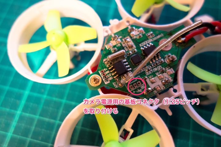 次にFPV用カメラの電源ですが、ここでは初心者用の練習機ということでハンダ付けするより簡単にカメラを取り外せ他の機体と使い回せるように基板端子を取り付けました