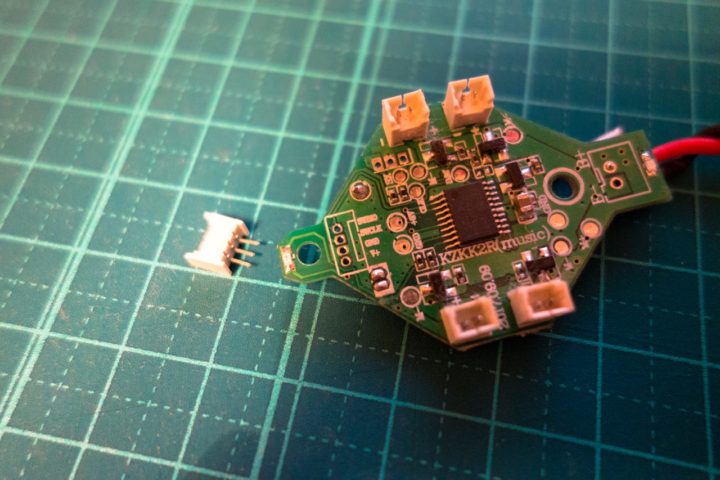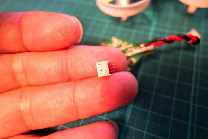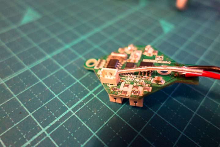 次にFC(フライトコントローラー)の電源端子部分がバッテリーと干渉してしまうので、この電源端子を取り外してJST-PH2.0のメス型のプラグケーブルをハンダ付けしてバッテリー周りの加工は完了です!