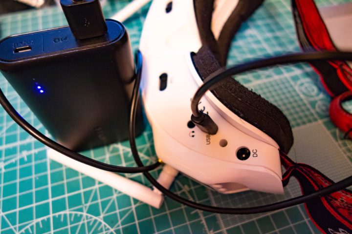 しかしEV200Dの標準で付属するヘッドストラップはバッテリーを後部に装着する形状となっており、ここからUSBケーブルをさらに繋いでモバイルバッテリーへと・・・この使い方が何ともスマートではなくケーブルの取り回しがめんどくさく!