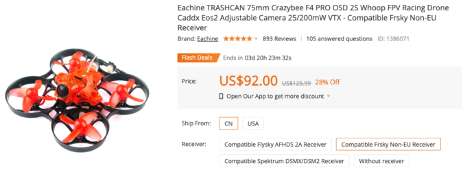 それではサクッと載せ替えていきたいと思いますが、その前に現在のTRASHCAの構成ですが、ロスト防止用のブザーを設置し、外部受信機(Frsky xm +)レシーバーを増設しています。