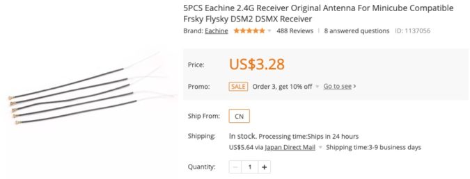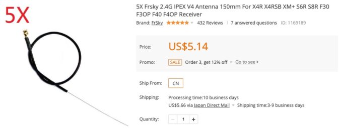 という事でWhoop形状の機体で使っているxm+レシーバーのアンテナはこの10cmタイプのものに変更しました。