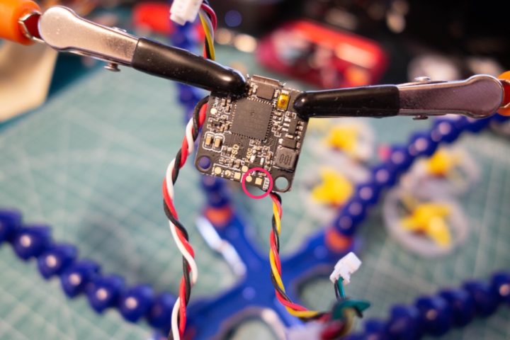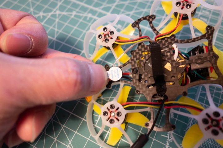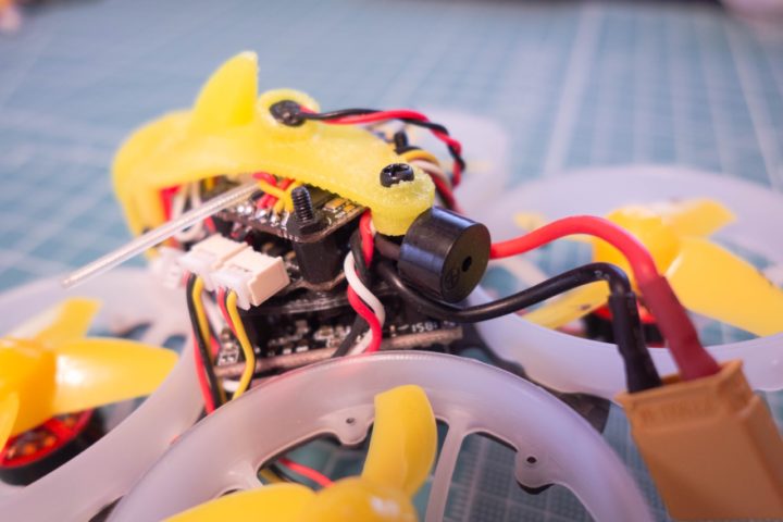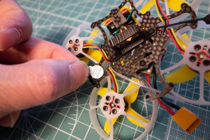 前回の機体解体でFC上にブザーポートの存在を確認できたので今回、野外飛行でのロスト防止のためブザーがを取り付けてみることに。