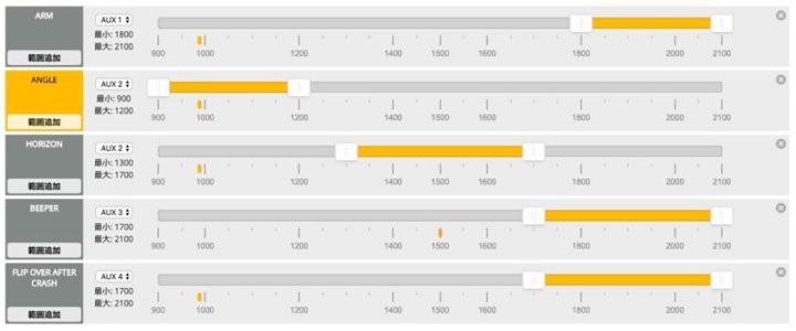 最低限の設定、BEEPER(ブザー)やFLIP OVER AFTER CRASH(タートルモード)などを追加しました。