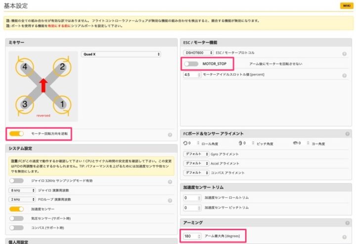 デフォルトで[モーター回転方向を逆転]設定にされていないので、Prop Wash対策のために逆転設定にしました。