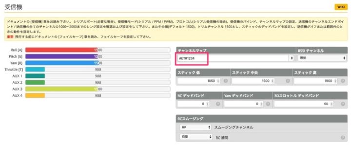 チャンネルマップをAETR1234に設定して完了です。(ここではFC内蔵受信機がFrskyで説明しています。)