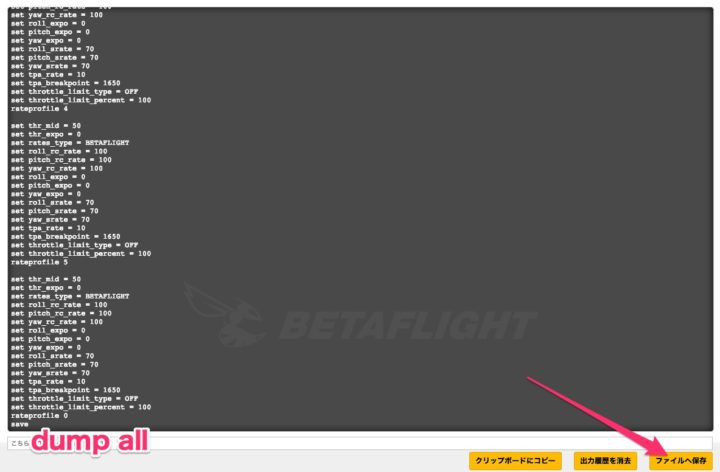 まずはBetaflightの【CLIコマンドライン】から[dump all]で初期状態の設定を保存しておきます。