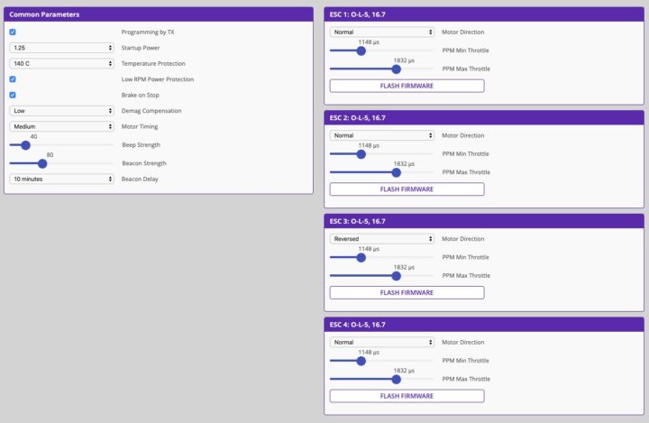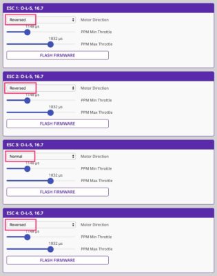 なぜか3番モーター(ESC 3)のみリバース設定がされていました。(モーターの配線の問題?)