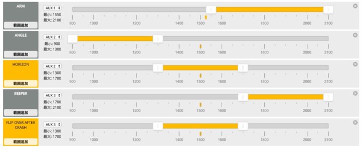 ブザー(BEEPER)とタートルモード(FLIP OVER AFTER CRASH)を追加しました。