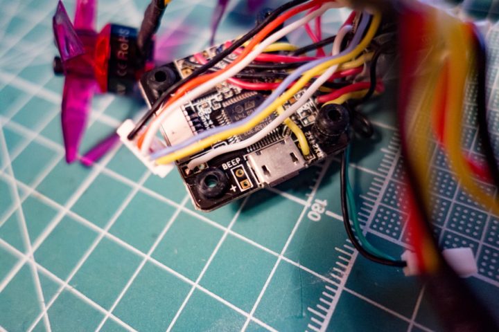 一本一本配線を見ていくとピッグテールから電源を共用し、レシーバーポート(SBUS)やLED_STRIPポート、VTXのVin・Vout・Smart AudioなどがFCに接続されているだけなので、選り分けていけば簡単なんですが、非常に複雑に見えるとともにスペース的にかなりタイトとなっています!