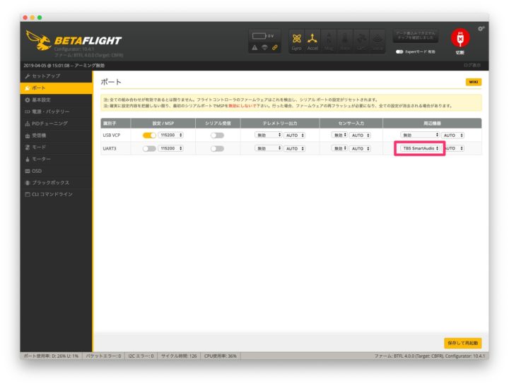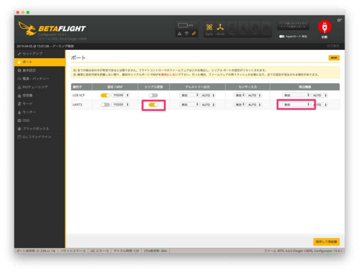 配線が完了したら、Betaflightからポートの割り当てをやっていきます。
