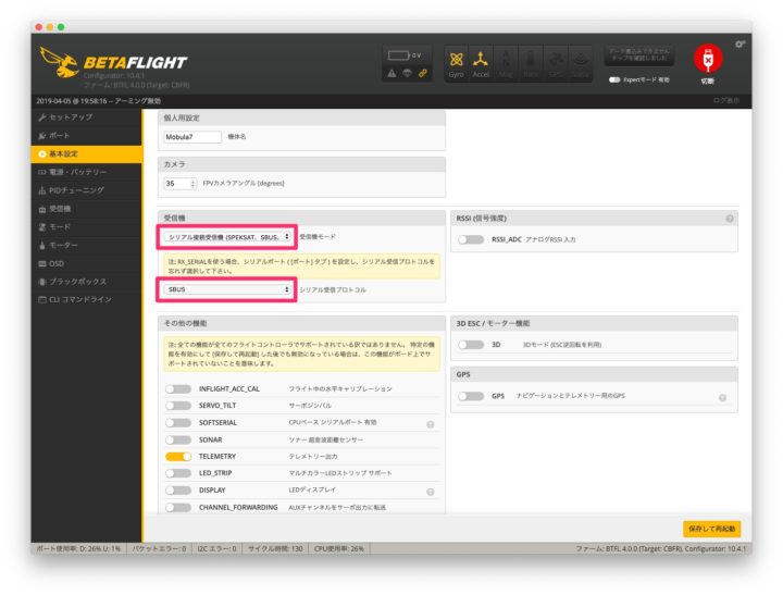 その他プロトコルの受信機でも同様だと思いますが、外部受信機を接続して使う場合Betaflightでの設定でSBUSを指定して外部受信機を使える状態(接続)しています。