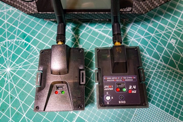 Taranis Q X7Sには送信機裏側のモジュールベイにガチッと差し込むだけなので簡単です。(ファームウェアをマルチプロトコル対応のものにする必要があります)