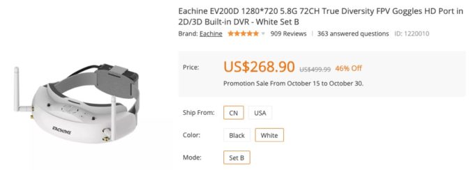 私がはじめて買ったゴーグル『Eachine EV100』となります。