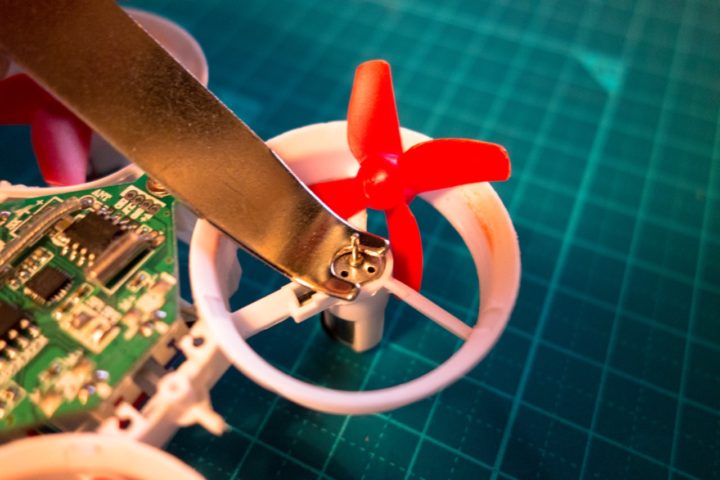 フレーム(モーター部分)を手で固定しながらテコの原理でクイっと押し上げると簡単にプロペラを外すことができます。