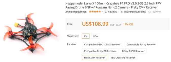 Happymodel Larva XにはFrsky xm+バージョンも販売されているので、受信機増設作業の手間を考えると受信機分少しお値段が高くなりますがこのバージョンを選択されるのがいいかと思います。