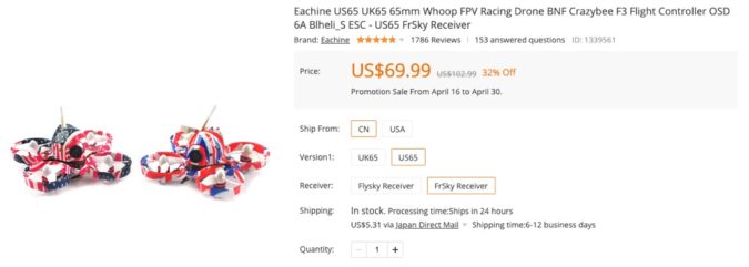 Eachine Twigにはキャノピーが無料で付属するギフトオプションがありますが、このオプションを外さないとクーポンが適応されないようです!Eachine US65 / UK65