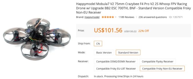 もう言わずとも知れた2セルWhoop名機『Happymodel Mobula7 V2』です。