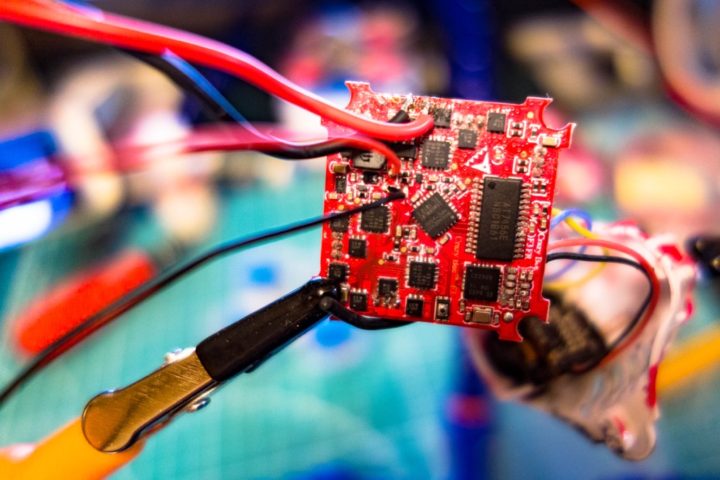 Crazybee F3 FCが使われていますが、ブザーを取り付けるためのポートが近接する部品とのピッチが非常に狭く半田作業はなかなか難しいものとなります。