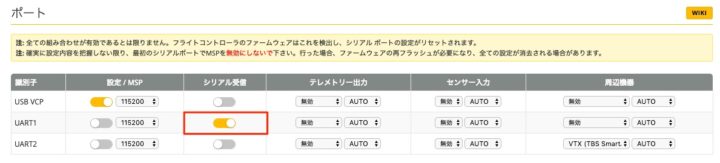 外付け受信機のSBUS入力なので、【ポート】でUART1を[シリアル受信]に設定。