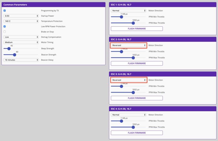 なのでBLHeliで、2番と3番モーターにReversed設定をしています。