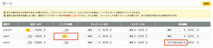 [受信機モード]をシリアル接続受信機、[シリアル受信プロトコル]をSBUSに変更。