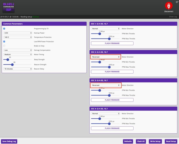 そこで2番と3番モーターをReversed設定し[Write Setup]で書き込んで完了です!