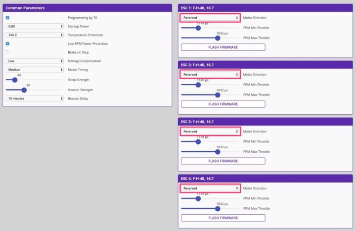 BLHeliから全てのモーター(ESC)をNormal→Reversed設定に変更します。