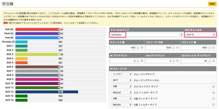 チャンネルマップをAETR1234に設定し、RSSIチャンネルをAUX12に設定して完了です。