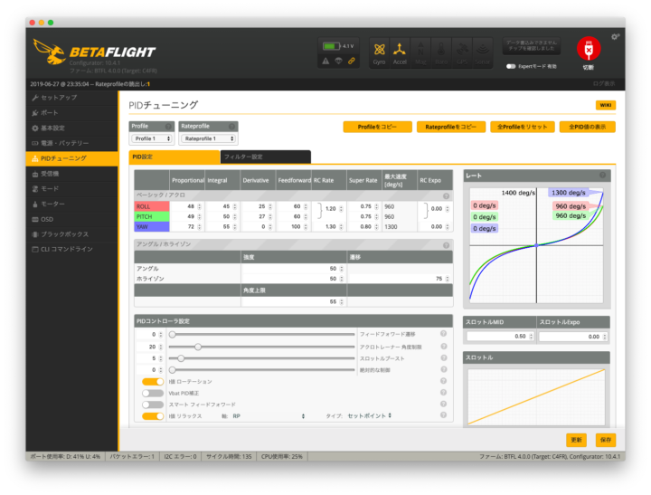 やはりデフォルトのレーツは少し高く感じられ、私のような初心者がはじめて飛ばす際は少し下げて飛ばし慣らしていくほうがいいと思います。