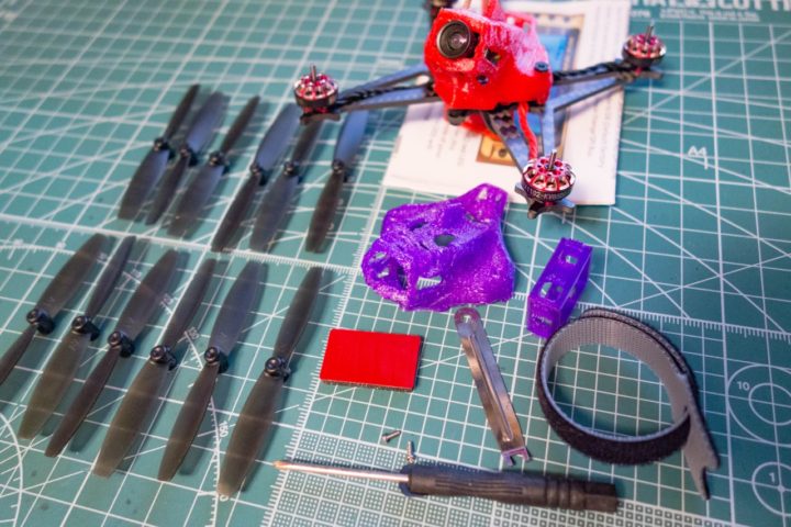 予備の紫キャノピー&バッテリーホルダーとペラが3セット(12枚)、バッテリー固定用のベルクロストラップ、プラスドライバー、ペラレンチ、モーター固定用のネジ(2本)、バッテリークッションが付属。