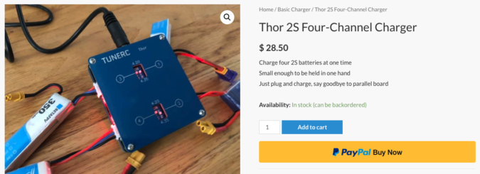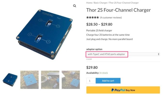 本充電器『Thor 2S Four-Channel Charger』の購入を検討されている方は、オプションでこのアダプタが付属したモデルも選択できるようになっているようですね。