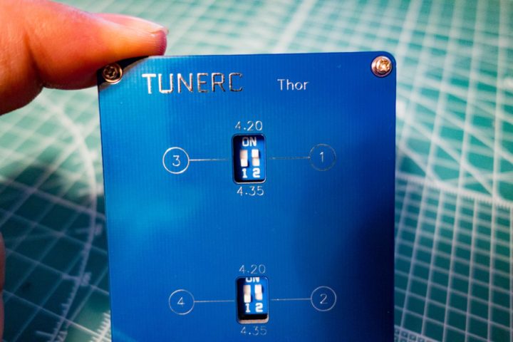 上面にあるディップスイッチでバッテリーの種類(HV 4.35V / Lipo 4.20V)を選択。