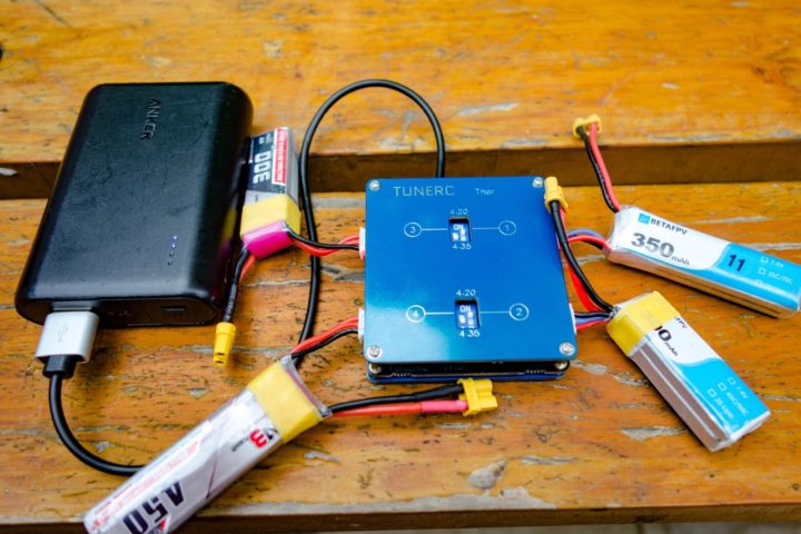 今回使用している『TUNERC Thor 2S Four-Channel Charger』では内部回路が独立しているので飛行後にバッテリーを充電し、さらに次のバッテリーを追加で充電・・・なんてことができ、さらにLipoやHVタイプも混載でき大変便利です!(ディップスイッチで選択)