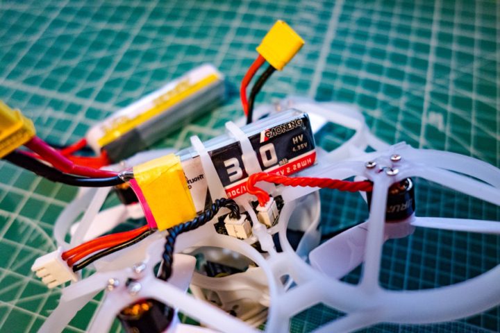 ピッグテールはXT30プラグが標準で取り付けられていますが、1セルバッテリー×2本の変換ケーブルも付属しているので1セルバッテリーを使って2セル機としても飛ばすことができます。