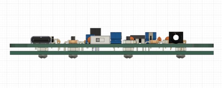 当初ピンヘッダーを使いこの2枚の基板を結合しようかと考えていましたが、ピンヘッダーのハウジングの高さは2.5mmあるのでこれでは1mmほど定位置から微妙にズレてしまいます。