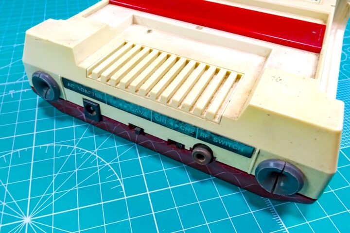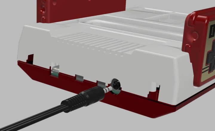 ファミコン本体ケースの上部背面には冷却用なのかな?スリットがいくつか開けられていますが、ここからカラフルに光が漏れるとカッコ良さそうです!